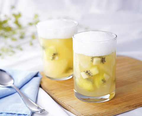 贅沢な2層仕立てのフルーツゼリーです。フワッとした食感のあわあわゼリーと、フルーツがゴロッと入ったゼリーで食べごたえも抜群♪グァバネクターの爽やかな味わいが広がる、一つで二度美味しいさっぱりデザートです。