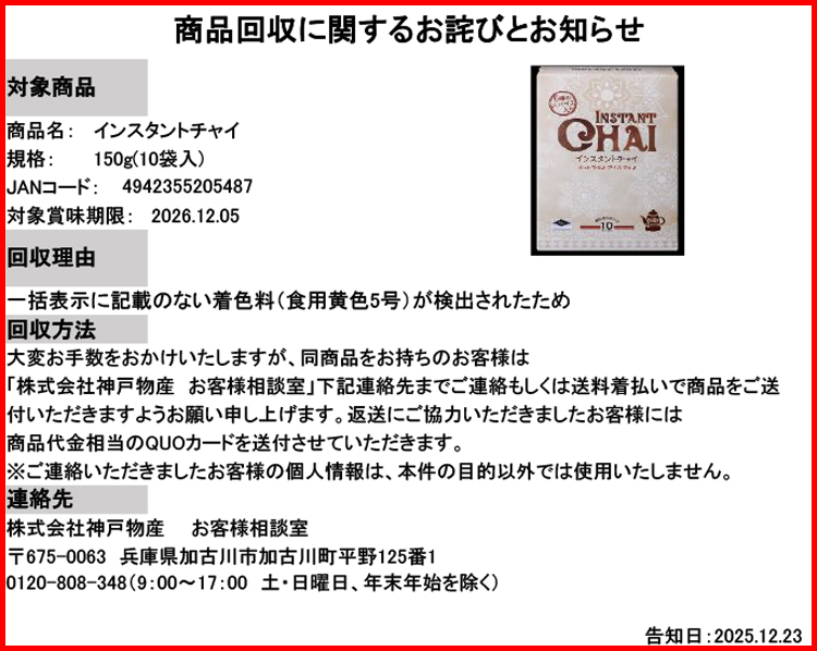ご迷惑をお掛け致しますが、「インスタントチャイ」の回収にご協力をお願い致します。